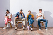 Uśmiechnięta ciężarna kobieta siedząca obok wielonarodowych ludzi w kolejce