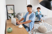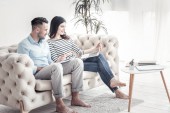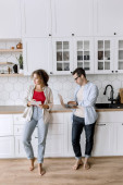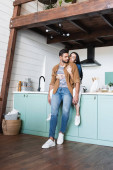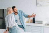 stylowa kobieta siedzi na blacie kuchennym w pobliżu chłopaka czytając książkę