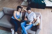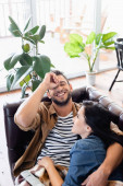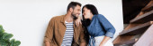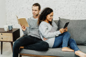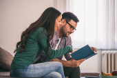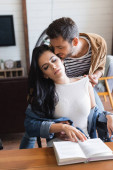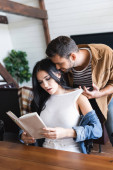 młody człowiek trzyma książkę w pobliżu wstrząśnięty dziewczyna obejmujące usta z ręki