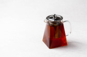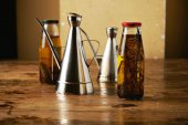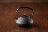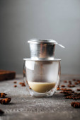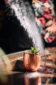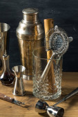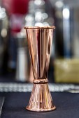 Zestaw narzędzi miedzianych z shakerem na drewnianym stole