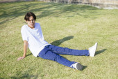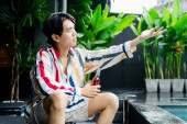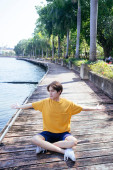 Zdjęcie "Facet w żółtej koszulce i niebieskich spodniach siedzi na balkonie nad jeziorem w parku i uśmiecha się." może być wykorzystywane do celów osobistych i komercyjnych zgodnie z warunkami zakupionej licencji Royalty-free. Obraz jest dostępny do pobrania w jakości wysokiej rozdzielczości do 5760x3840.