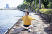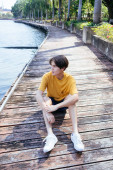 Facet w żółtej koszulce i niebieskich spodniach siedzi na balkonie nad jeziorem w parku i uśmiecha się.