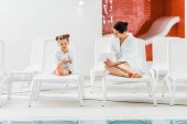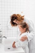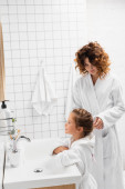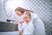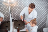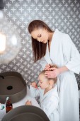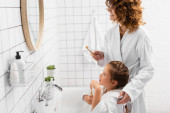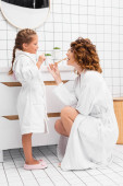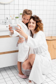 Uśmiechnięta kobieta biorąc pastę do zębów w pobliżu dziecka w łazience