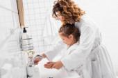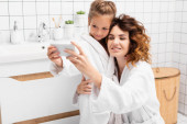 Zdjęcie "Uśmiechnięta kobieta biorąc pastę do zębów w pobliżu dziecka w łazience " może być wykorzystywane do celów osobistych i komercyjnych zgodnie z warunkami zakupionej licencji Royalty-free. Obraz jest dostępny do pobrania w jakości wysokiej rozdzielczości do 5760x3840.