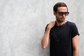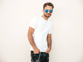 Portret przystojny pewny siebie stylowy hipster lambersexual model.Man ubrany w T-shirt. Moda mężczyzna pozowanie na ulicy w pobliżu białej ściany na zewnątrz w okularach przeciwsłonecznych