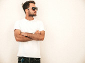 Zdjęcie "Portret przystojny pewny siebie stylowy hipster lambersexual model.Man ubrany w T-shirt. Moda mężczyzna pozowanie na ulicy w pobliżu białej ściany na zewnątrz w okularach przeciwsłonecznych" może być wykorzystywane do celów osobistych i komercyjnych zgodnie z warunkami zakupionej licencji Royalty-free. Obraz jest dostępny do pobrania w jakości wysokiej rozdzielczości do 5760x3840.