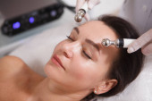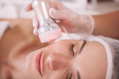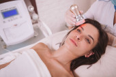 Piękna zrelaksowana kobieta korzystających rf-lifting sesji w salonie piękności. Profesjonalny kosmetolog wykonujący zabieg zaciskania skóry dla klientki