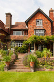 Zdjęcie "Duży luksusowy dom i ogród w Wielkiej Brytanii z meblami ogrodowymi na patio w lecie" może być wykorzystywane do celów osobistych i komercyjnych zgodnie z warunkami zakupionej licencji Royalty-free. Obraz jest dostępny do pobrania w jakości wysokiej rozdzielczości do 5760x3840.