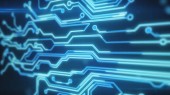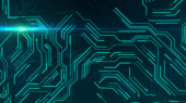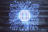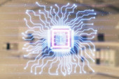 Sygnały przechodzące przez mikroobwody do procesora. Koncepcja globalnej technologii. Technologiczna abstrakcyjna planeta Ziemia. Ilustracja 3D