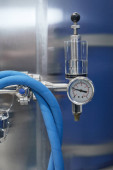 Zbliżenie obrazu tła ciśnieniomierza na zbiorniku magazynowym w warsztacie browaru przemysłowego, przestrzeń do kopiowania
