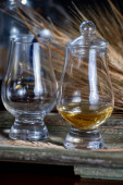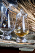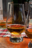 Szklanki whisky single malt i blended whisky serwowane w barze w Edynburgu, Szkocja, Wielka Brytania