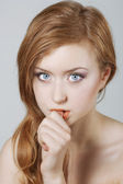 piękna dziewczyna, na białym tle na światło - szary tło, emocje, kosmetyki