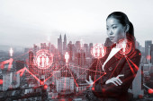 Uśmiechnięta czarna kobieta Dyrektor HR w międzynarodowej firmie myśli o rekrutacji wysoko wykwalifikowanych specjalistów. Kobiety w biznesie. Hologram mediów społecznościowych ikony nad Singapurem.
