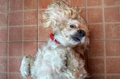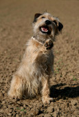 ładny niechlujny terier pies stojący na jej tylne nogi, śmiejąc się. pies jest jedenaście lat