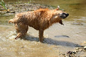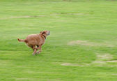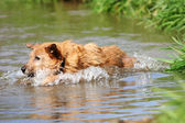 ładny niechlujny terier pies biegnąc na trawie. pies ma 9 lat