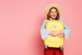 Ładna kobieta w kapeluszu z walizką na różowym tle