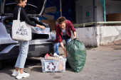 Widok człowieka trzymającego pojemnik w pobliżu niebieskiej torby na śmieci w samochodzie
