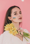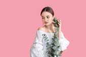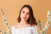 Piękna młoda kobieta z kwitnącymi gałęziami wiosny na tle koloru