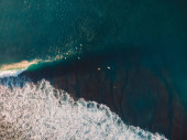 Widok z powietrza na czystą wodę oceanu, fale i surferów na wyspie Bali. Widok z góry