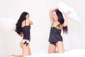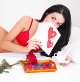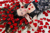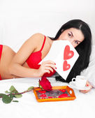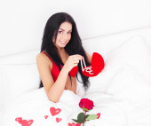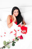 piękna brunetka kobieta budzi się i odkrywa róża w łóżku