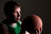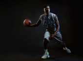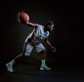 Skupiony koszykarz trzyma piłkę w studio, czarne tło. Profesjonalny męski piłkarz w odzieży sportowej gra sportowa, wysoki sportowiec