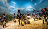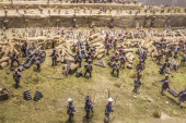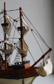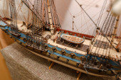 Badajoz, Spain - Dec 26th 2017: Royal Navy rowboat with surviving crew sail away from damaged warship. Diorama built by unknown artist