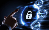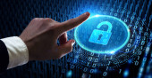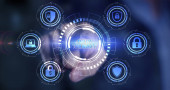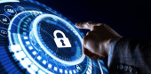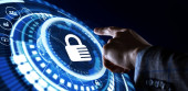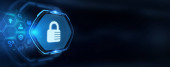 Koncepcja prywatności technologii bezpieczeństwa cybernetycznego. Młody biznesmen wybierz bezpieczeństwo ikony na wirtualnym wyświetlaczu.