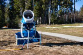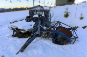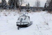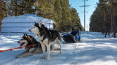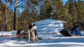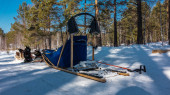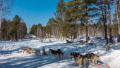 Na zaśnieżonej drodze jest psi zaprzęg. Drewniane biegacze, rękawiczki dołączone. Czerwona lina kotwicy jest rozciągnięta. Przed nami ekipa syberyjskich husky. Las iglasty na tle błękitnego nieba.