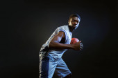 Koszykarz pozuje piłką w studio, widok z tyłu, czarne tło. Profesjonalny męski piłkarz w odzieży sportowej gra sportowa, wysoki sportowiec