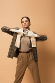 pełna długość modna kobieta w kratkę marynarka i spodnie pozowanie na beżowy