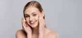 szczęśliwa młoda kobieta z niebieskimi oczami i pianką oczyszczającą na twarzy odizolowana na szaro