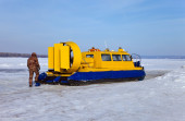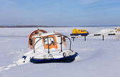 Poduszkowiec na brzegu rzeki mrożone przeciw błękitne niebo