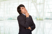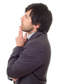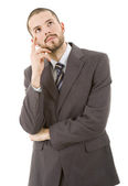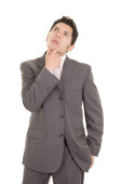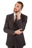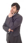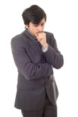 martwi się działalności człowieka w garniturze, na białym tle