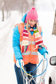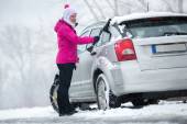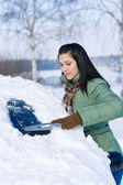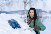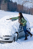 Zimą samochód - kobieta usunąć śnieg z szyby z Skrobaczka do szyb