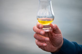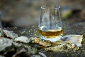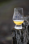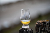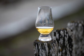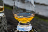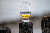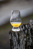 Degustacja dram single malt whisky na wybrzeżu Szkocji, stare drewniane słupy ze szkłem whisky