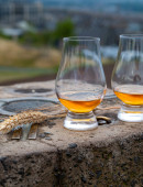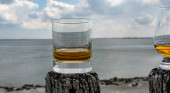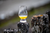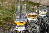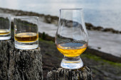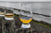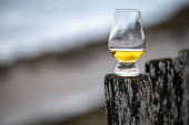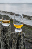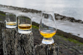 Degustacja dram single malt whisky na wybrzeżu Szkocji, stare drewniane słupy ze szkłem whisky