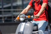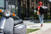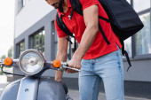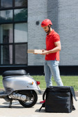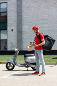 Widok na paczki kuriera trzymające pizzę w pobliżu termo plecaka i skutera