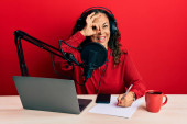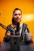 Azjatycki gospodarz radiowy w okularach i słuchawkach trzymających filiżankę kawy i patrzących w kamerę