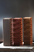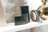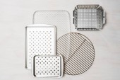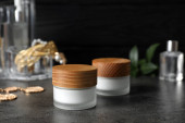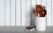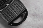 Różne nowoczesne graty na czarnym stole. Miejsce na tekst