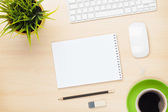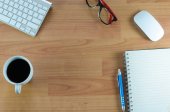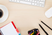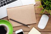 Stół biurowy z notatnikiem, komputerem i filiżanką kawy