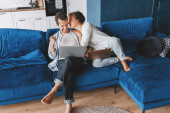 Zdjęcie "Młoda szczęśliwa rodzina para zbadać plan papierkowej roboty budżet rodzinny poprosić o poradę siebie siedzących w przytulnym domowych użytek wewnętrzny laptop. Koncepcja współpracy w zakresie projektowania wnętrz" może być wykorzystywane do celów osobistych i komercyjnych zgodnie z warunkami zakupionej licencji Royalty-free. Obraz jest dostępny do pobrania w jakości wysokiej rozdzielczości do 5760x3840.