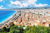 Widok na cote d 'Azur w Nicei, Francja. Wielokrotny odpoczynek na plaży, budynki, błękitna woda Morza Śródziemnego, wzgórza na tle