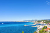 Zdjęcie "Widok na cote d 'Azur w Nicei, Francja. Wielokrotny odpoczynek na plaży, budynki, błękitna woda Morza Śródziemnego, wzgórza na tle" może być wykorzystywane do celów osobistych i komercyjnych zgodnie z warunkami zakupionej licencji Royalty-free. Obraz jest dostępny do pobrania w jakości wysokiej rozdzielczości do 5760x3840.