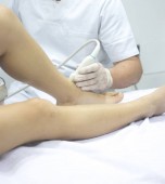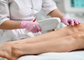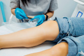 Damskie dłonie w niebieskich rękawiczkach zakładają jednorazowe skarpetki na stopy klienta. Salon piękności lub zabiegi medyczne. Masaż lub pedicure.