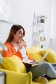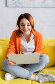 skoncentrowana kobieta czytanie książki w salonie w domu