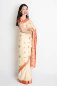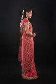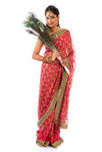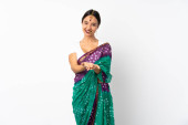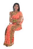 Indyjski kobieta uśmiechając się i strony pokazano coś