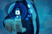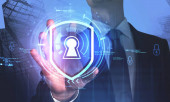 Man hand dotykając wirtualnej ikony telefonu komórkowego. System bezpieczeństwa cybernetycznego dla smartfonów, dostępu do haseł i hakowania Internetu.