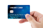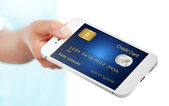 telefon komórkowy z kartą kredytową przechowywany przez ręce na białym tle nad odrobina