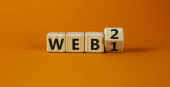 Symbol WEB 1.0 lub 2.0. Obrócił drewnianą kostkę i zmienił słowa WEB 1.0 na WEB 2.0. Piękny pomarańczowy stół, pomarańczowe tło, przestrzeń do kopiowania. Biznes, technologia i koncepcja WEB 1.0 lub 2.0.