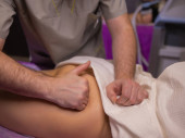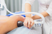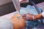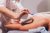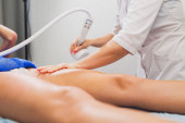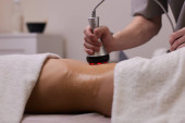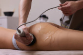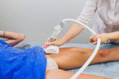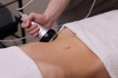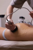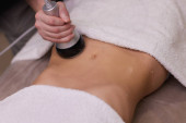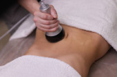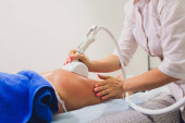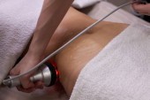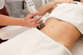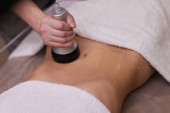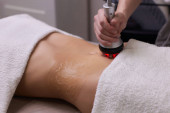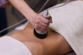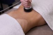 zabieg usuwania cellulitu na żeńskim brzuchu, kawitacyjny masaż brzucha. Ultradźwiękowy masaż dla utraty wagi. Korekta figury kobiety bez interwencji chirurgicznej. Zbliżenie brzucha.